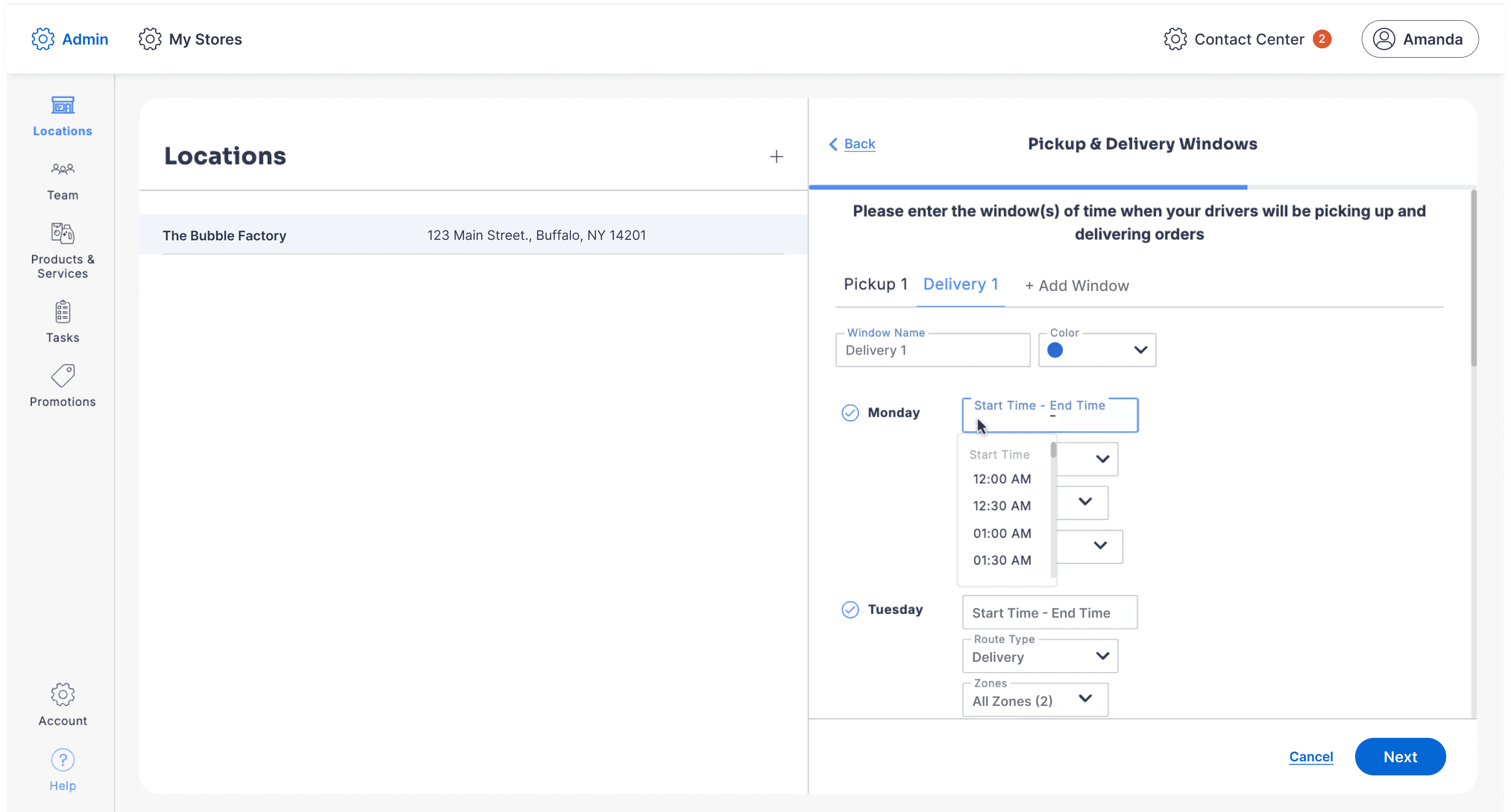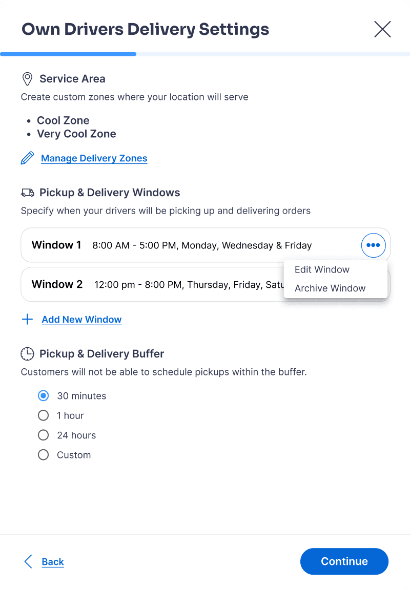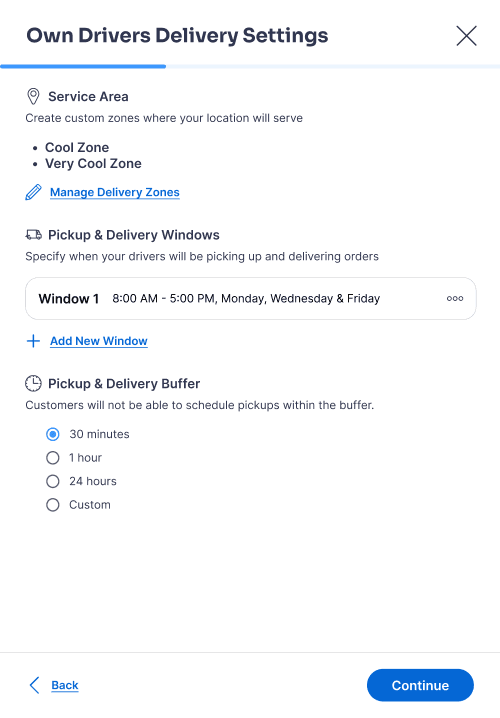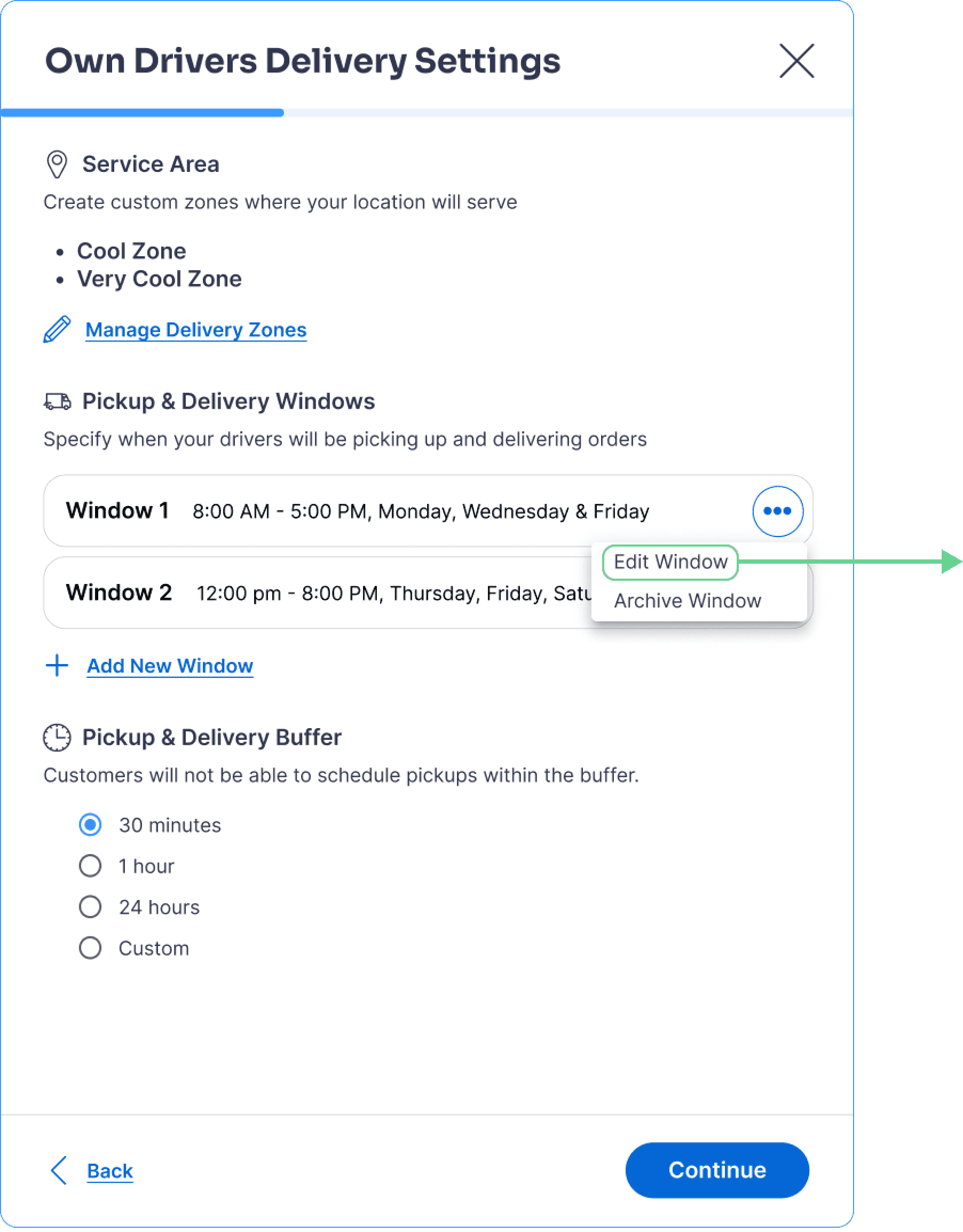 Increases Motivation: Previewing downstream settings (delivery windows and buffers) helps operators understand why delivery zones are required, increasing motivation to complete setup.