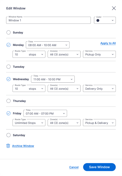 Problem: Operators frequently manage 8-15 windows per location, and the existing design made it nearly impossible to audit, compare, or remove outdated windows, which lead to misconfigured schedules, missed pickups, and support tickets.