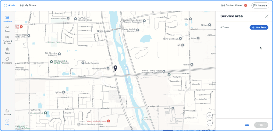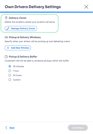 On the new panel, clicking “Manage Delivery Zones” opens the geofencing wizard.